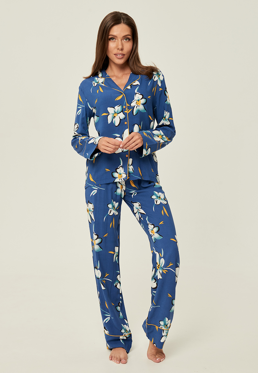 Удобный, комфортный домашний костюм из вискозы. Принт из цветов на темно-синем фоне. Костюм состоит из брюк и блузы с лацканами и длинными рукавами.