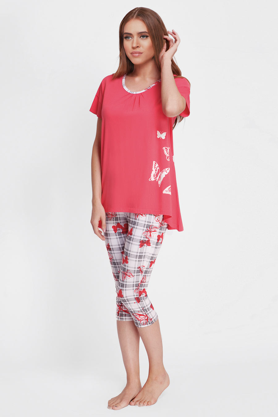 Очаровательный комплект для дома и отдыха, состоящий из удлиненной туники и бриджей. Яркая туника свободного, расклешенного силуэта выполнена из хлопкового полотна. Круглый вырез горловины декорирован контрастной отделкой. Принт на полочке украшает изделие и придаёт ему легкости. Бриджи прилегающего силуэта, с классическим принтом, который освежают сочные "бабочки".