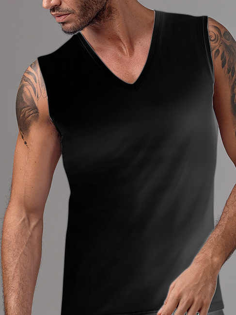 Однотонная мужская майка прямого кроя с V-образным вырезом горловины.
