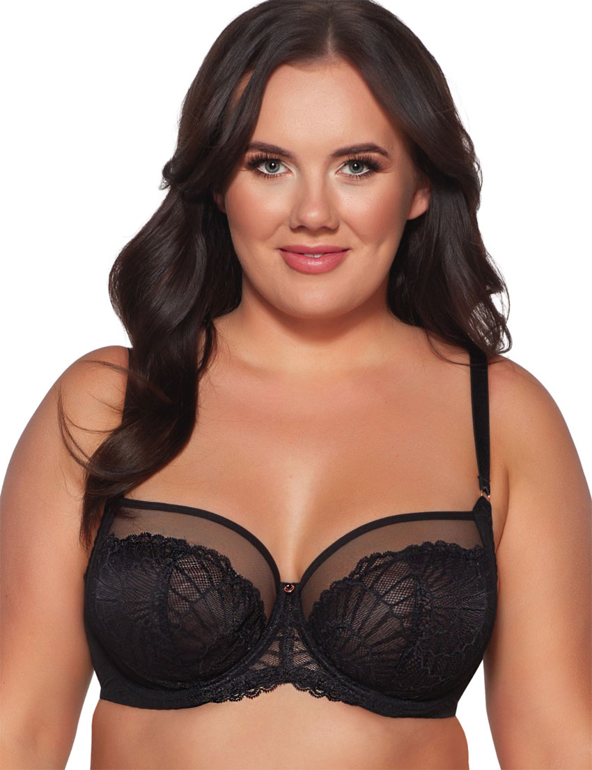 Бюстгальтер выполнен с шитыми мягкими чашками на косточках. Бретельки регулируются по длине, не отстёгиваются. На спине застёжка на удлинитель, количество крючков в ряду застёжки увеличивается пропорционально размеру бюстгальтера. Фурнитура металлическая цвета меди.