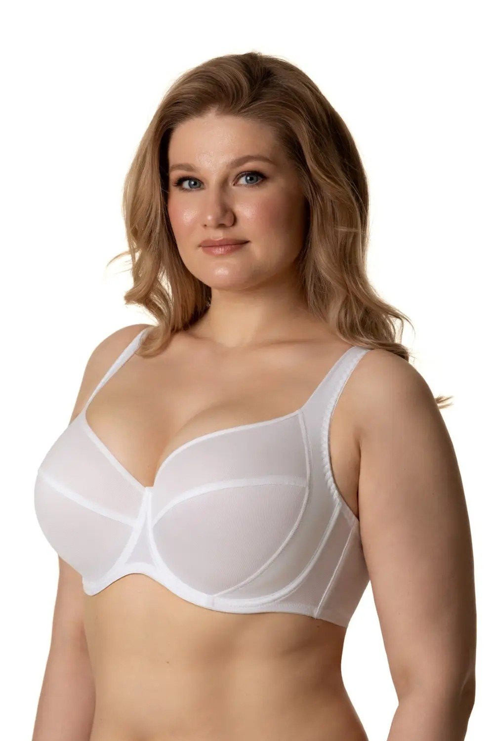Бюстгальтер на каркасах с мягкой чашкой. Чашки имеют диагональное членение и боковую поддержку, переходящую в усиленную переднюю часть бретели. Это позволяет высоко приподымать грудь, собирая её к центру и придавая ей правильную округлую форму.