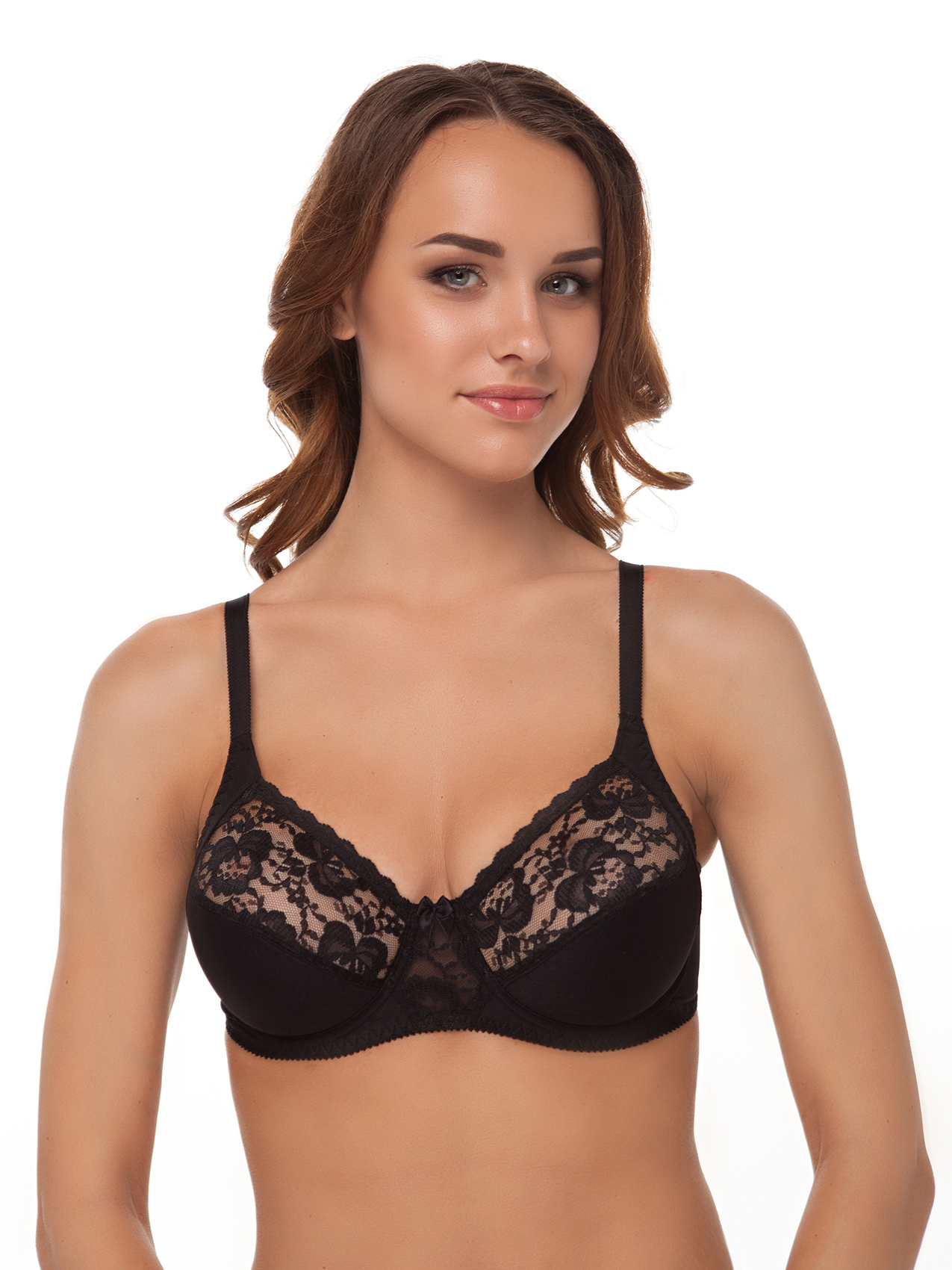 Бюстгальтер из неэластичного трикотажного полотна и кружева, на каркасах. Мягкие чашки из двух частей. Боковая корректирующая деталь красиво сгруппирует бюст к центру.