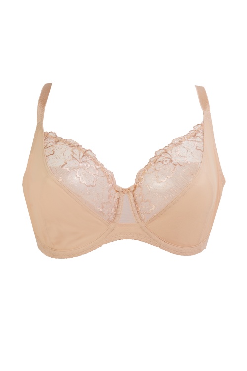 Бюстгальтер из эластичного трикотажного полотна и эластичного кружева. Мягкие чашки на каркасах с тройным диагональным членением, такая конструкция создает округлую форму груди. Маечный тип стана. Используется четырехрядная застежка, что позволяет идеально отрегулировать объем бюстгальтера. Ширина бретелей и застежки изменяется в зависимости от размера бюстгальтера.