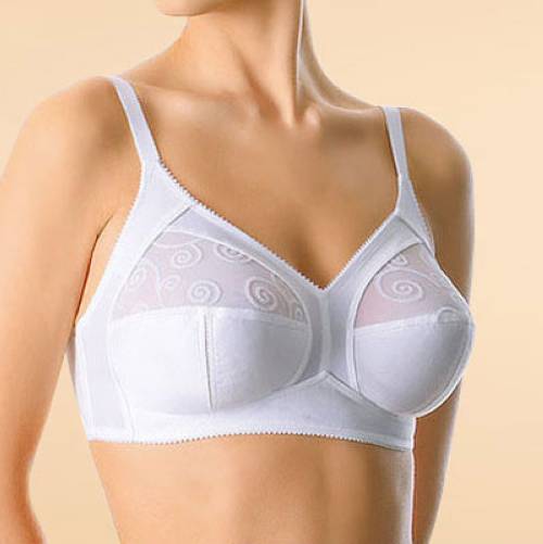 Бюстгальтер без каркасов из эластичного полотна и трикотажного полотна. Нижняя деталь чашки и центральная часть бюстгальтера дублированы х/б тканью. Верхняя деталь чашки из эластичной сетки с набивным рисунком в технике «флок». В модели использованы боковые упругие пластины. Швы отделаны «мережкой».