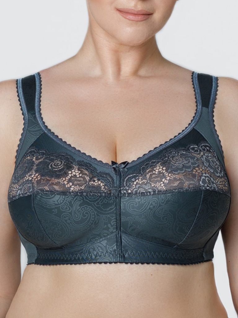 Бюстгальтер „Soft“ без каркасов, плотно облегает и визуально уменьшает грудь. • Внутренняя часть чашки бюстгальтера и ластовица трусов изготовлены из хлопкового полотна. • Верхняя часть чашки обработана эластичной тесьмой — это помогает кружеву прилегать к груди и не дает ему растянуться при носке. • Боковые детали стана обработаны плотным эластичным полотном и отделочной лентой. • Серединка бюстгальтера уплотнена специальным трикотажным полотном, которое соединяет обе чашки и помогает удерживать стабильную форму бюстгальтера. • Бретели бюстгальтера продублированы поролоном, поэтому они не натирают и не раздражают кожу. • Регуляторы и каркасы изготовлены из сплавов металлов, не вызывающих аллергию. • В середину каркасной ленты вставлен слой трикотажного полотна, который не позволяет выходить каркасам и придает ленте мягкость. • Концы металлических каркасов защищены специальной капсулой. • Застежка бюстгальтера подобрана для изделий больших размеров, поэтому сила растяжения равномерно распределяется по всему объему. • Все используемые материалы подтверждены сертификатом Oeko-Tex 100.