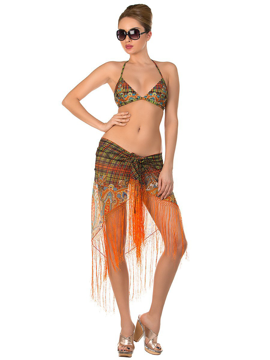 Пляжное парео-шаль треугольной формы, оформленное шелковой бахромой. Эффектный принт в сочетании шотландской клетки и восточного пейсли идеально гармонирует со всеми купальниками коллекции.