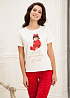Пижама, состоящая из однотонной фуфайки с оригинальным принтом и набивных брюк с карманами и манжетами.