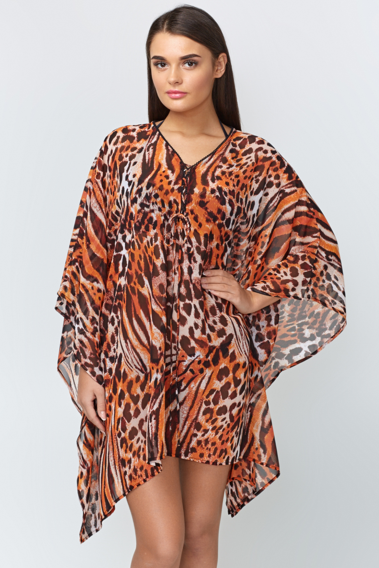 Пляжное платье из принтованного шифона, декорированное ассиметричным подолом и V-образным вырезом со шнуровкой.