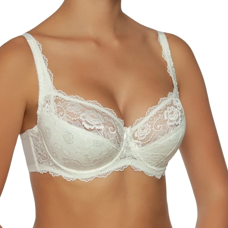 Полупоролоновый бюстгальтер на большую размерную группу из эластичного кружевного полотна с цветочным узором. Верхняя деталь чашки выполнена из кружева, нижняя деталь продублированная мягким поролоном. Внутренняя поверхность чашек хлопковая. Обеспечивает и усиливает естественную поддержку груди. Широкие бочки из эластичной микрофибры укреплены дополнительными вертикальными каркасами, которые помогают сохранять форму стана. Бретели из эластичной тесьмы. Регуляторы длины сзади. Декор - атласный бантик.