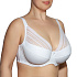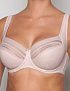 Бюстгальтер "полупоролон" с подкроем из эластичного кружева с орнаментом "полоска", эластичной микрофибры и полотна soft. Нижние детали чашки на дубляже с хлопком. Боковой подкрой переходит в бретель. На стане бюстгальтера боковые корректирующие пластины. Украшение: атласный бантик.