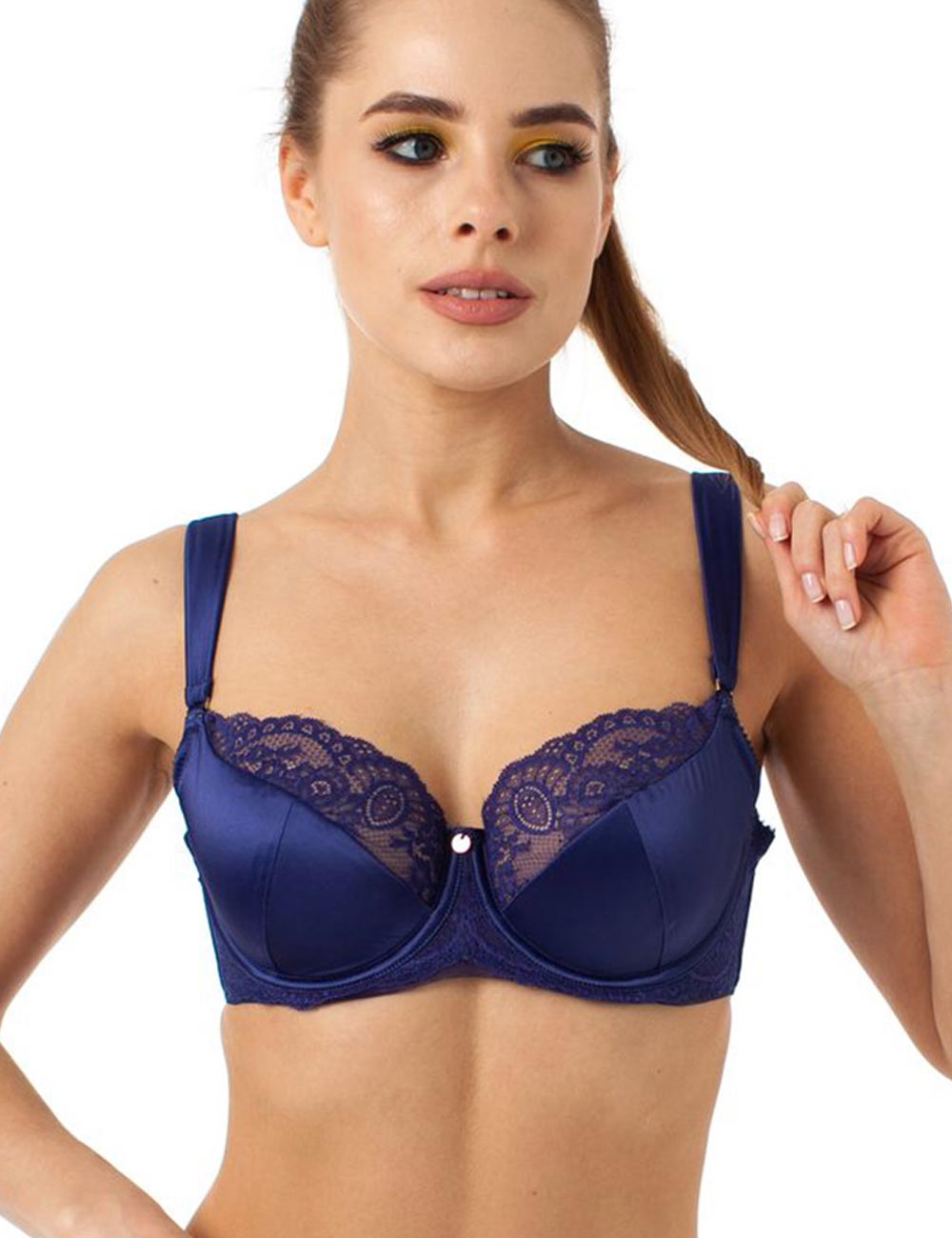 Бюстгальтер полупоролон, выполнен из сатинового полотна и эластичного кружева, широкие бретели, обтянутые сатиновым полотном. Украшение металлический медальон.