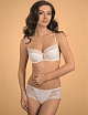 Бюстгальтер "Balconette"" на каркасе, с Т-образным сечением по чашке, поднимает и держит грудь снизу, образуя декольте. Чашка выполнена из ажурного кружева, нижняя часть продублирована ламинатом из поролона и хлопка, верхний край "лодочка" обработан эластичной тесьмой - это помогает чашке прилегать к груди и не дает ей растянуться при носке. В этой модели удачно сочетаются и дополняют друг друга форма чашки "балкон" и ажурная "лодочка" из кружева, которые делают эту конструкцию чашки более глубокой и закрытой. Эластичная бретель с краем "пикотом" декорирована контрастным цветом в тон бантикам.