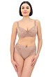 Бюстгальтер с полудублированными чашками, на стане, на каркасах. Чашки с тройным диагональным членением. Верхний край чашки из вышивки усилен эластичной тесьмой, нижние детали из эластичного полотна на дубляже. Центральная и боковые детали стана усилены монокапроном, в боковых швах – упругие пластины. Ажурные регулируемые бретели, спереди украшены вышивкой. Декор – атласный бант.