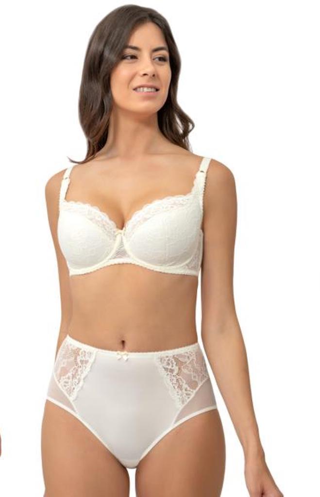 Бюстгальтер полудублированный на стане, на каркасах. Нижние детали чашек на дубляже с хлопком. Верхние детали чашек из эластичного кружева продублированные эластичной сеткой. Верхний край усилен эластичной тесьмой. Передняя и боковые детали стана укреплены монокапроном, в боковых швах упругие пластины. Бретели «anti-slip».Материал: сутажное кружево, эластичная сетка.Декор: атласный бант