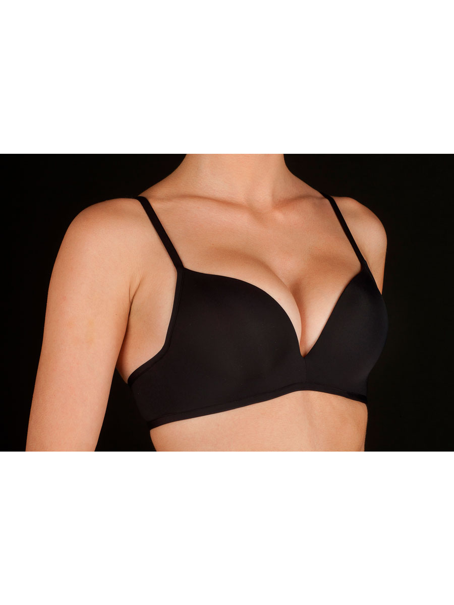 Базовая модель бюстгальтера из микрофибры, с косточками и чашками пуш-ап с наполнителями, подчеркивающими декольте.
