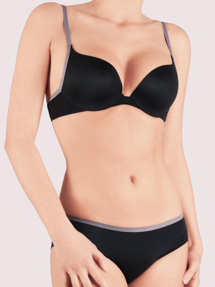 Замечательный бюстгальтер с плотными чашечками push-up создаст соблазнительное декольте. Ультразвуковая технология обработки ткани обеспечивает бесшовное соединение, делая модель абсолютно незаметной под облегающей одеждой. Инновационная супер мягкая ткань бюстгальтера необычайно приятная и комфортная. Гладкая подкладка на внутренней стороне чашки оформлена красивым узором.Застежка два крючка в три позиции.