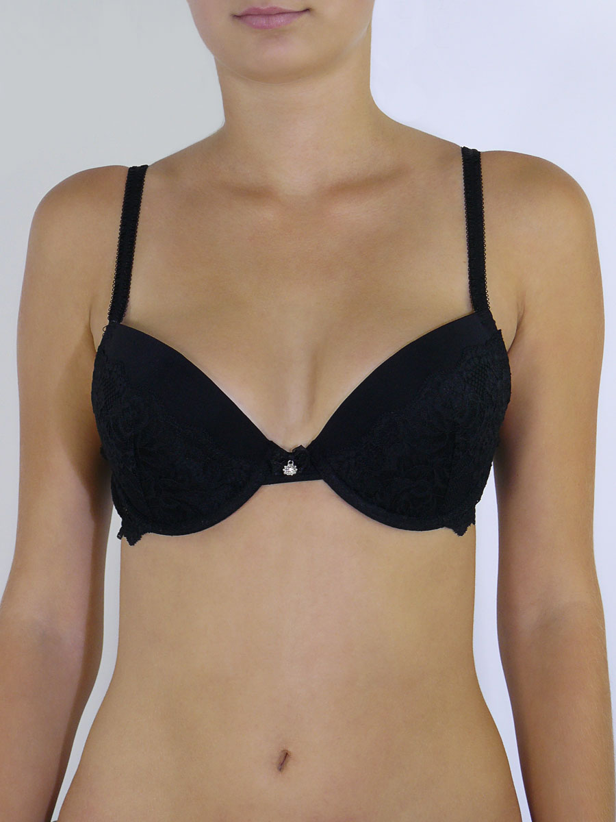 Бюстгальтер формованный Push-up на каркасах, чашка Luna. Выполнен из эластичной мягкой микрофибры и кружева с растительным узором плетения. Бретели несъёмные, регулируемые по длине. Внутренняя поверхность чашки - 100% хлопок. В качестве декора используется бантик из органзы с подвеской из страз.