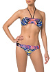Модный молодёжный купальник из двух предметов. Бюст – комбинированное бандо с центральной стяжкой и тонкой завязкой на шею в кольцо, фиксируется фирменной застёжкой на спине. Плавки новой конструкции: эффектное танго с широким отворотом, который мягко компенсирует образование нежелательных складок по линии бёдер. Оригинальный принт коллекции – синтезированный рисунок в ярких, динамичных цветах, усилен сияющим эффектом блестящей лайкры от Carvico.