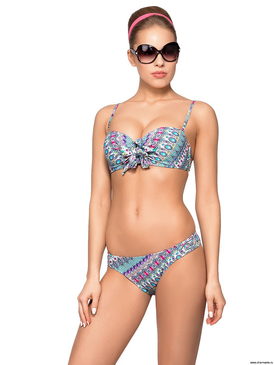 Комбинированный раздельный купальник из двух предметов. Бюст – формованный балконет на каркасах с отстегивающимися регулируемыми бретелями и застежкой на спине. Завязки в центре бюста можно фиксировать разными способами, меняя визуальный образ модели. Глубокие плавки комфортной посадки со средним боком декорированы вставками из спагетти. Купальник выполнен в многоцветном принте «Тутти-фрутти» с поместным расположением рисунка драгоценностей.