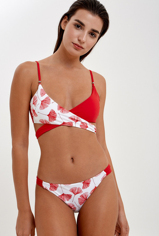 Раздельный купальник с лифом на запахе и лентами завязывающимися сзади. Мягкая чашка со съемными вкладышами для придания красивой формы груди. Регулируемые несъемные бретели, декорированные бусинами спереди. Трусики с низкой талией и декоративными сборками по бокам.