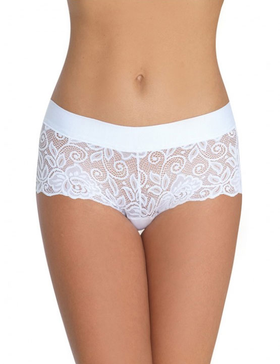 Трусы шортики со средней линией талии и средним боком. Выполнены полностью из эластичного кружевного полотна с цветочным узором. Верхний срез обработан тонкой эластичной резинкой. Срезы проймы ног кружевные. Ластовица хлопковая.