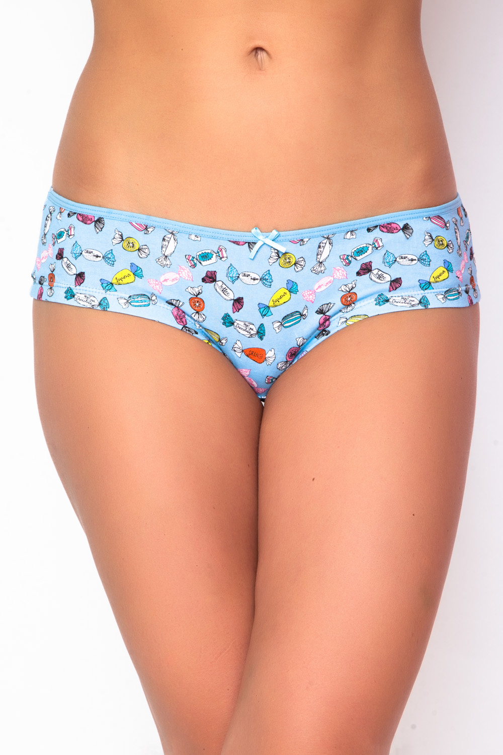Трусы-шорты из хлопка с эластаном, с трендовым принтом "конфетки", пояс изделия подчеркнут плоской резинкой и бантиком.