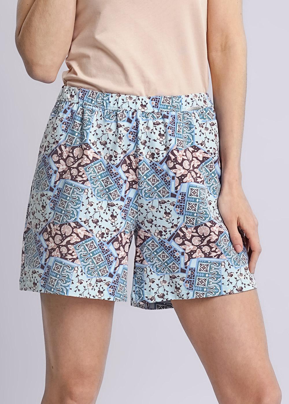 Шорты свободного кроя из набивного хлопкового полотна с добавлением эластана с поясом на резинке.