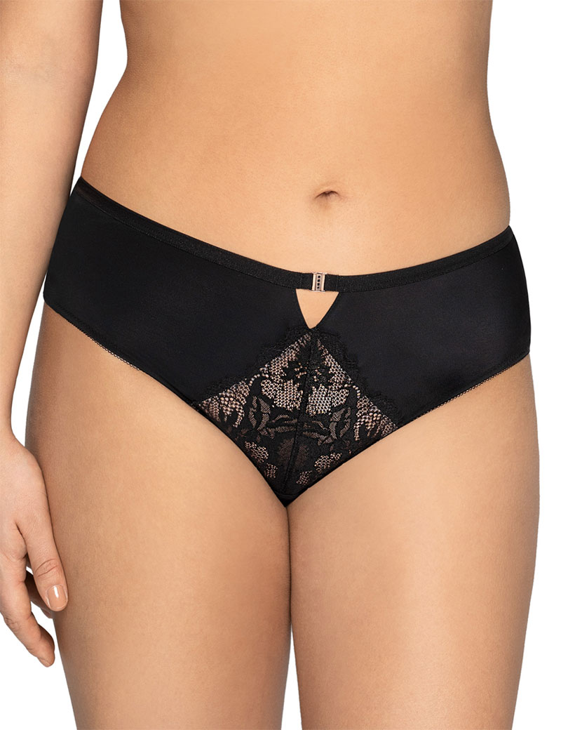 Женские слипы Ava 1939 из модной коллекции ЮККА черного цвета, со средней линией талии и комфортным боком. Выполнены из эластичного полотна с микрофиброй, с кружевной вставкой спереди, продублированной сеткой телесного цвета. Верхний срез отделан плоской эластичной резинкой. Спереди декор - металлическое украшение цвета меди со стразами. Срез проймы задней детали плоский, бесшовный, выполнен в сгиб из двойного слоя мягкой эластичной сеточки, не выделяется под одеждой. Ластовица из хлопка.