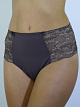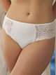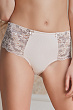 Трусы панти со средней линией талии. Выполнены из кружева и микрофибры. Сложный орнамент кружева выполнен из нитей разной толщины и фактуры – матовой и блестящей.