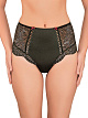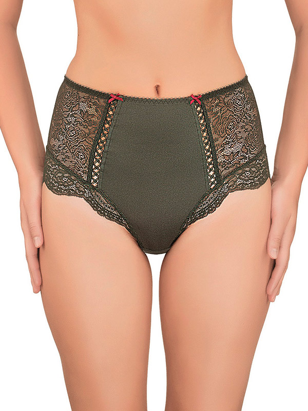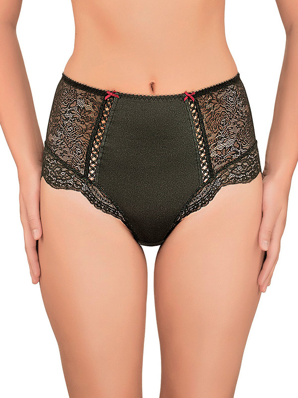 Классические трусы с высокой линией талии. Впереди и сзади, центральная деталь, эластичное микроволокно. В боковой части детали из эластичного кружевного полотна. Спереди, в боковую часть, вработана декоративная ленточка в виде шнуровки. По нижнему срезу детали из эластичного кружева, не обработанные лентами.