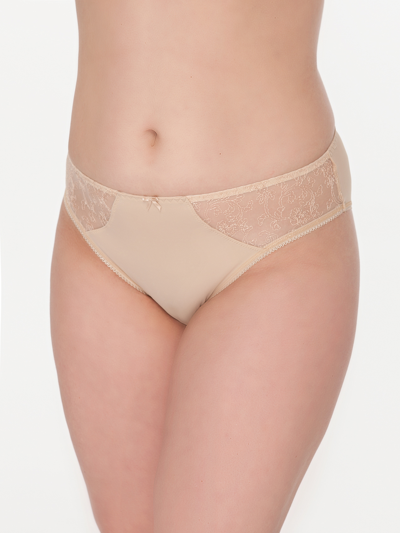 Трусы «слип» из эластичного трикотажного полотна и неэластичного вышитого полотна. Средняя линия талии. Отделка - атласный бантик.