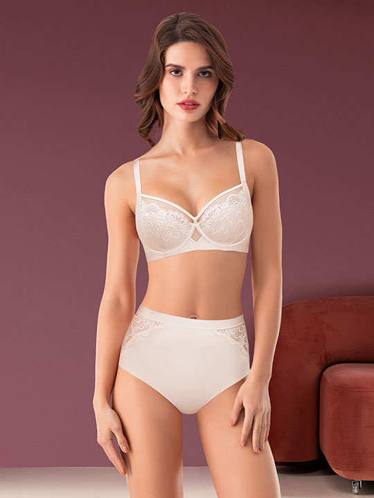 Трусы-слип с высокой линией талии. Высота бочка 16 см. Двуслойная, проклеенная передняя деталь. По талии имеется проклеенный поясок в 1,5см вместо резинок и по ножкам микрофибра фрикат. Выполнены из микрофибры фрикат (free cut), сетки, кружева с оригинальным орнаментом. Коллекция "Gala".