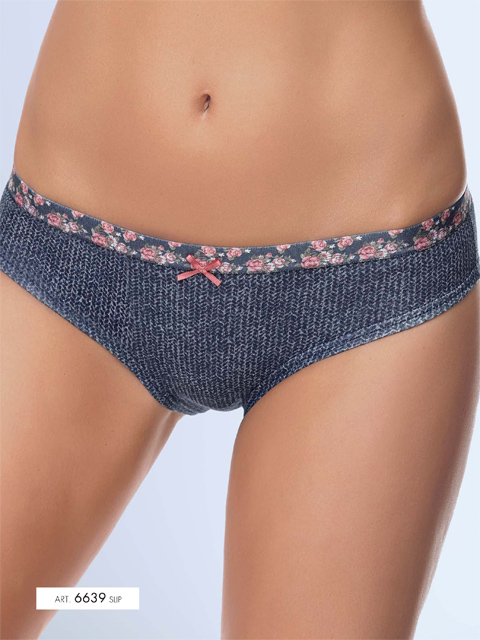 Трусы-слип из хлопка с эластаном, заниженный пояс отделан тесьмой с рисунком "кружочки" или "цветы", спереди маленький бантик. Рисунки в ассортименте: "пье-де-пуль", "вязка" или "шотландская клетка".