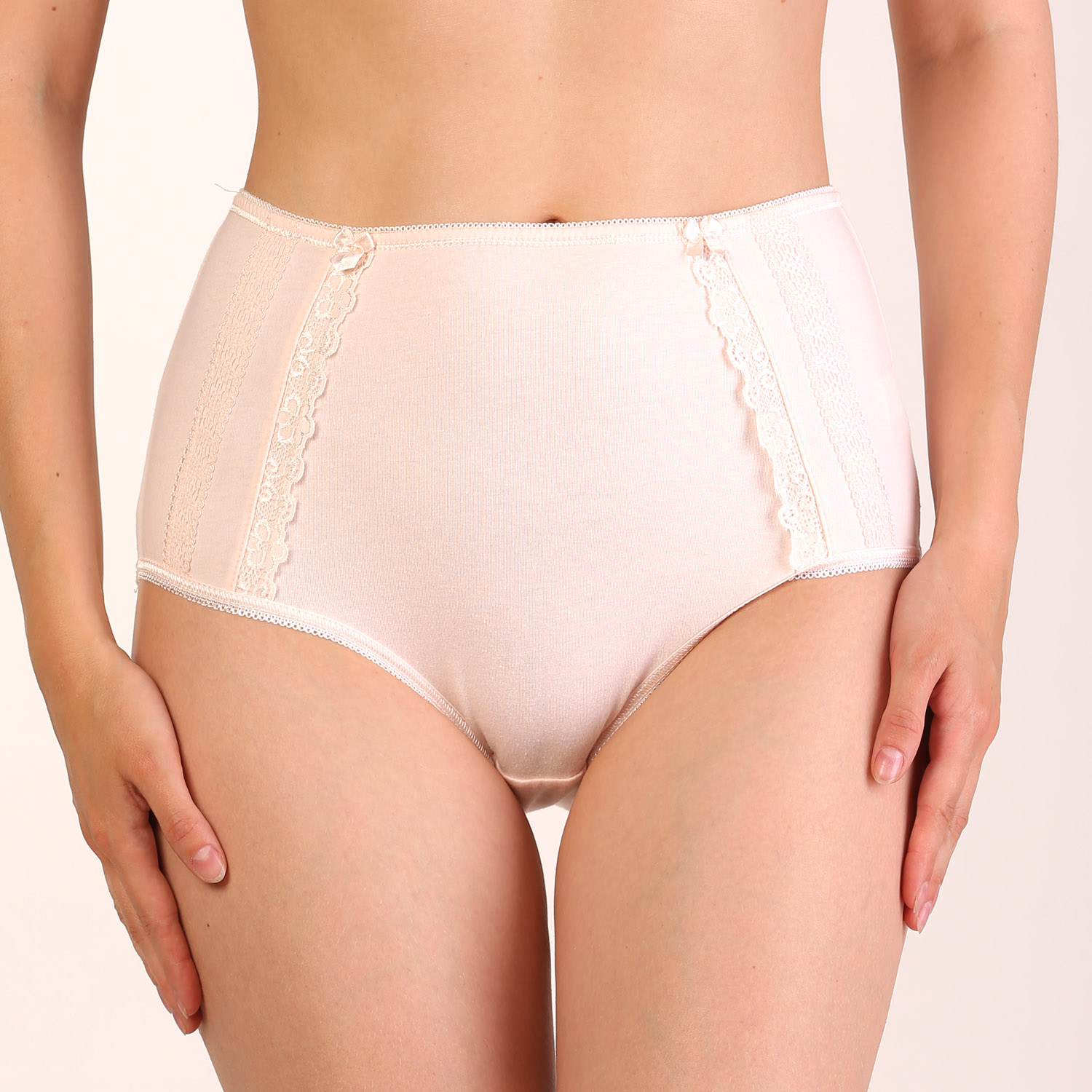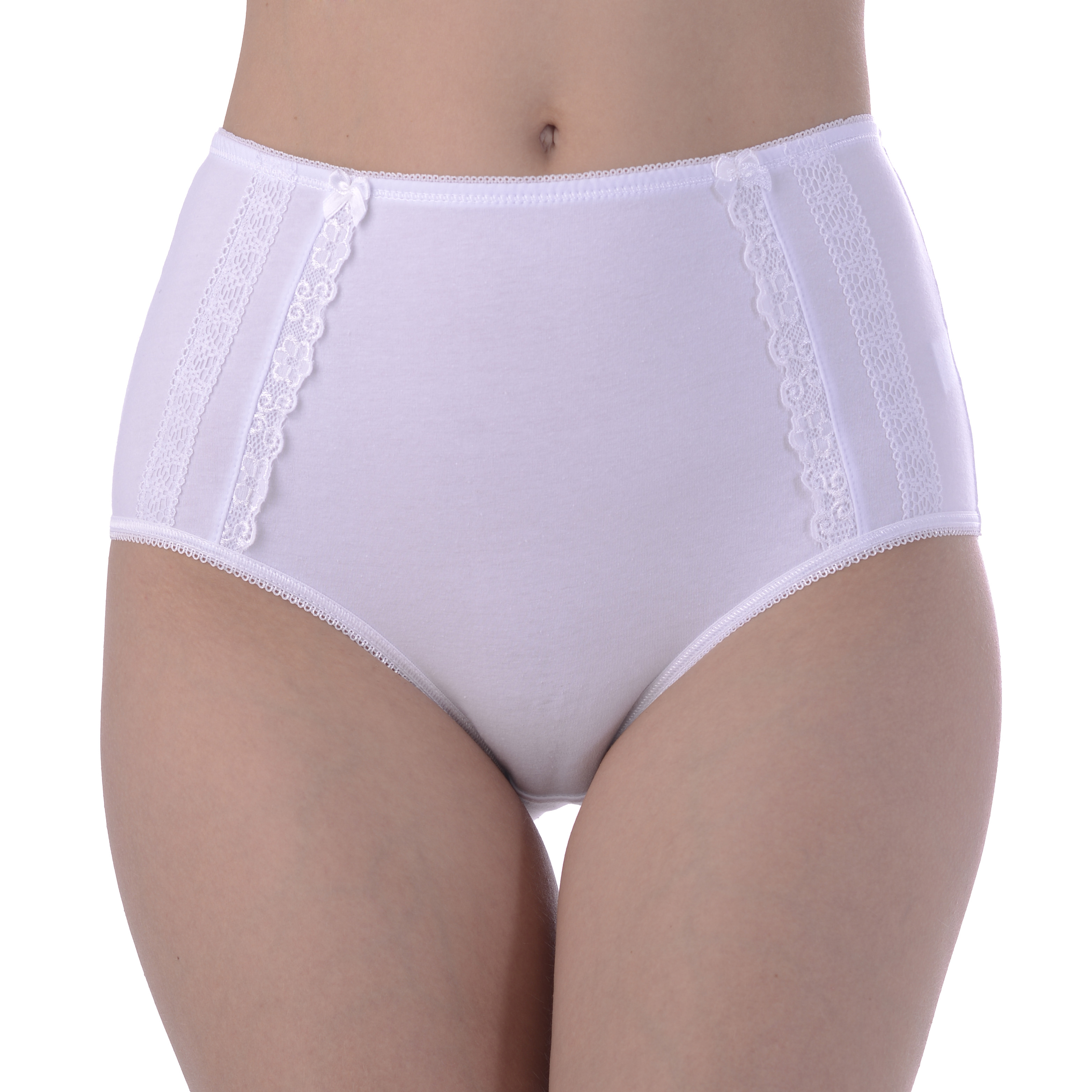 Элегантные трусы-макси с завышенной талией и низкой линией бедра. Модель выполнена из высококачественного хлопка. Трусики украшают нежные однотонные кружева по бокам изделия.