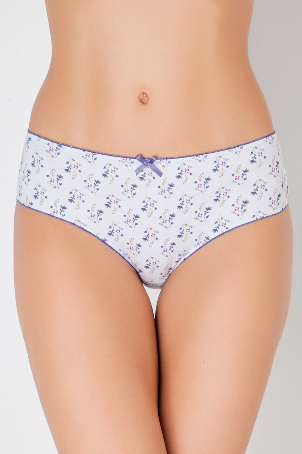 Слипы из высококачественного хлопка с эластаном, с мелким цветочным принтом. Задняя часть изделия по ножке декорирована нежным кружевом. Пояс украшен бантиком.