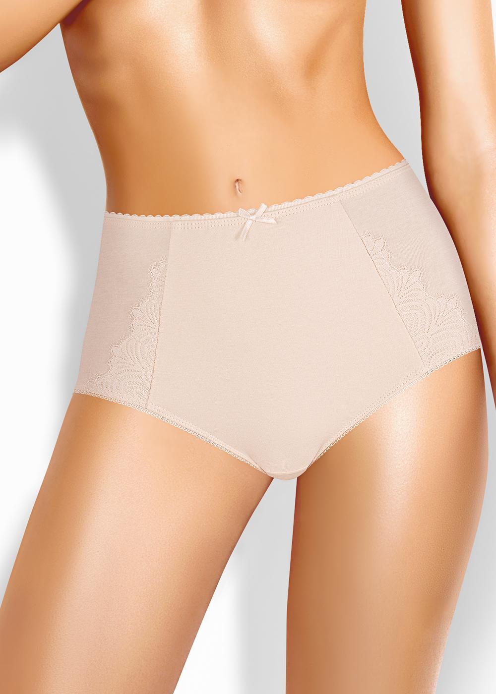 Трусы женские макси с легким утягивающим эффектом. По поясу и ножкам выполнена обработка резинкой с фестоном. По переду отрезной бочок декорирован кружевом.