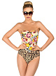 Эффектный купальник монокини классического кроя – лиф с формованными чашками на каркасной поддержке, фиксируется съемными завязками-спагетти на шее. Принцип формирования фигуры - утягивающая сетка Power net по линии живота. Принт детального расположения оформлен сияющими стразами.
