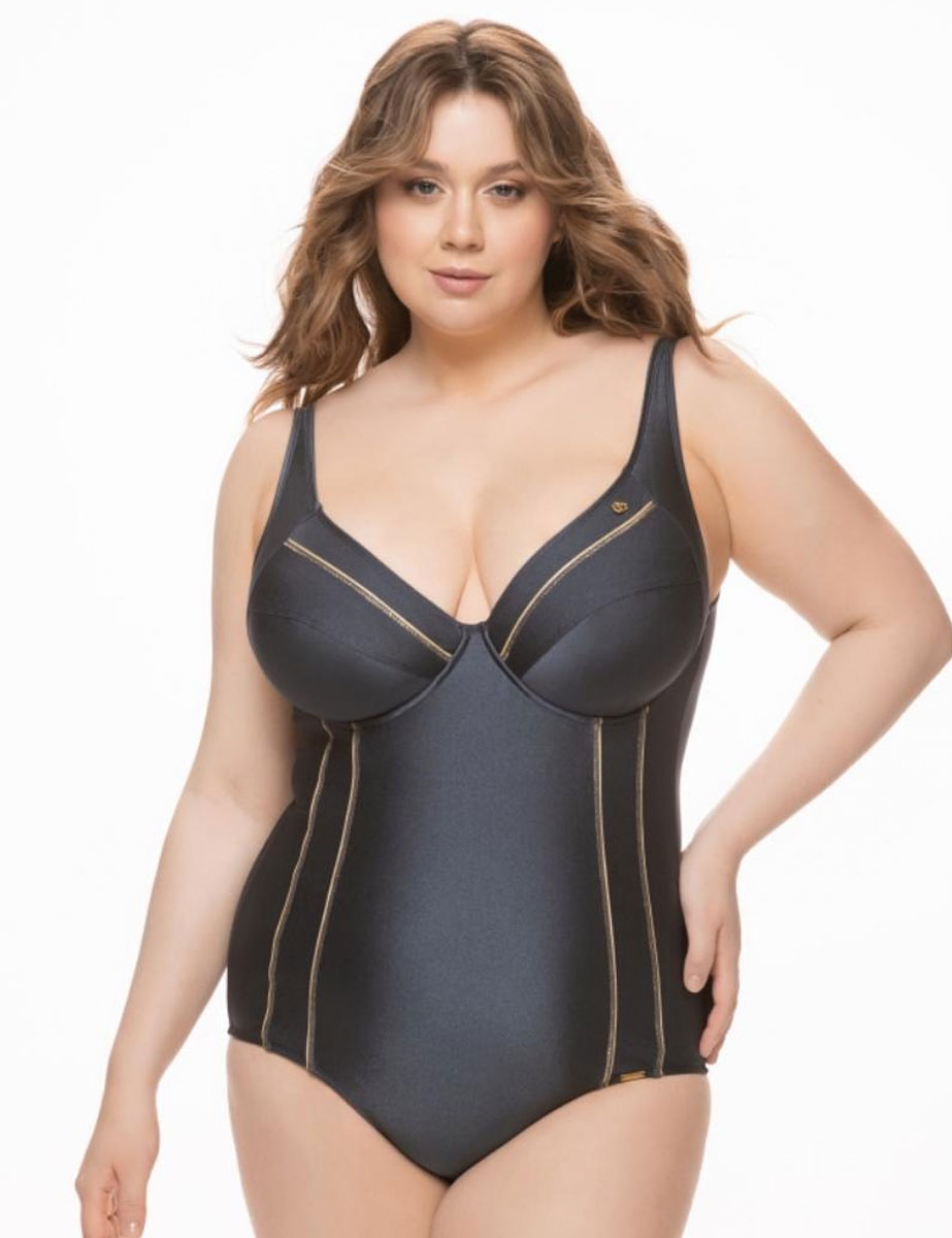 Сплошной купальник на каркасах с мягкой чашкой без уплотнения выполнен из однотонной ткани, с декоративной отделкой металлическими нитями,что позволяет формировать красивый силуэт.Бретели с регуляторами позволяют идеально подогнать посадку лифа на любую грудь. Перед купальника дублирован подкладочной тканью. Купальник сзади имеет вырез округлой формы средней глубины.