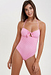 Слитный купальник с фигурным вырезом и узлом по центру. Мягкий лиф-бандо со съемными вкладышами. Съемные бретели на шее. Фигурный вырез на спинке. Трусики классической формы.