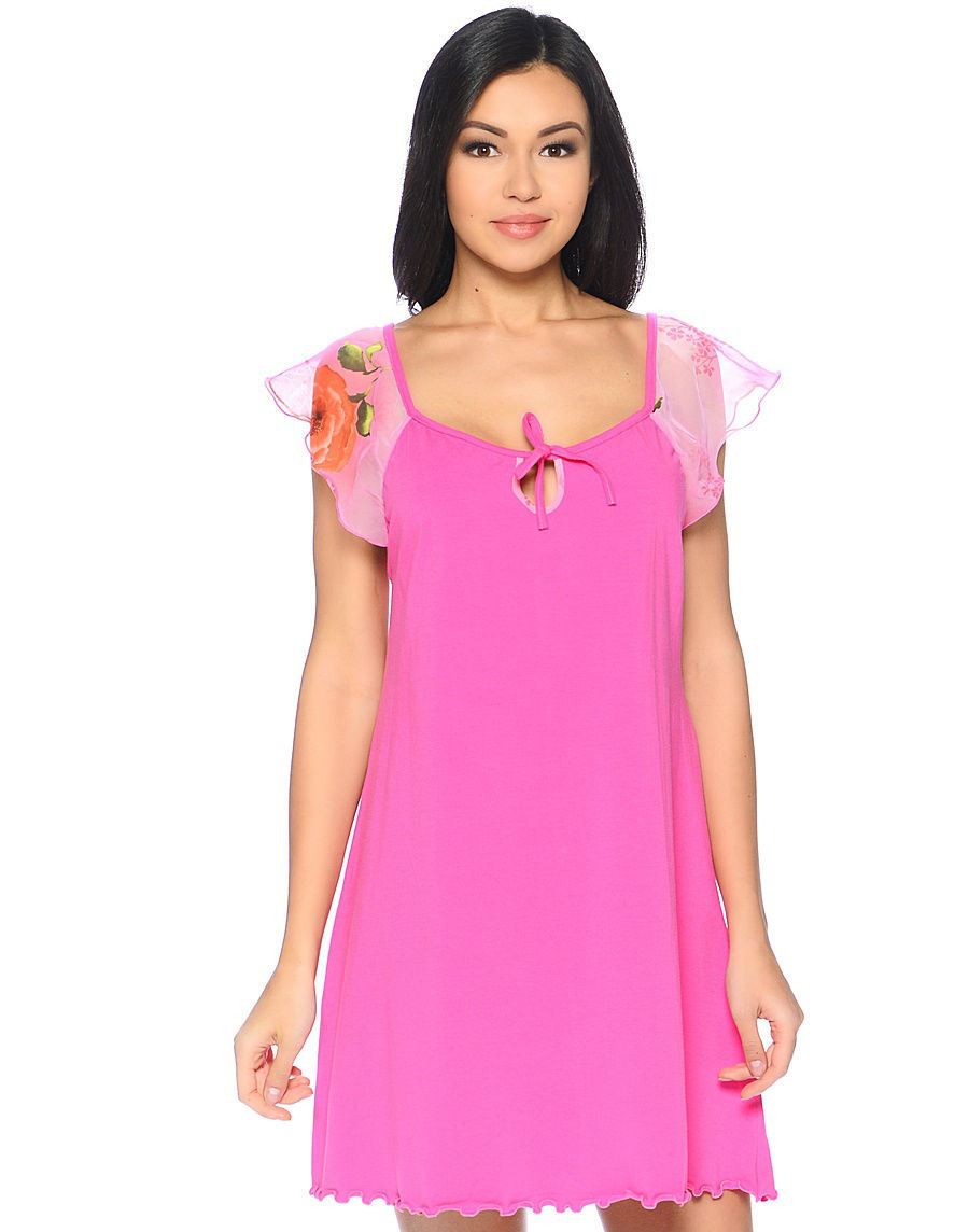 Комфортная сорочка из нежного однотонного хлопкового трикотажа. Свободной формы, рукав-реглан из цветного шифона, вырез горловины украшен капелькой на завязках.