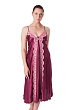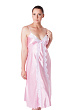 Женская длинная сорочка из однотонного шелка в восточном стиле, полуприлегающего силуэта, расклешенная книзу, на тонких регулируемых бретелях, с отрезным лифом, спинка с глубоким вырезом и декоративным фигурным поясом, полочка по всей длине, вырез спинки и лиф богато декорированы контрастным кружевом с фестонами. Длина изделия до середины икр ног.