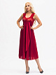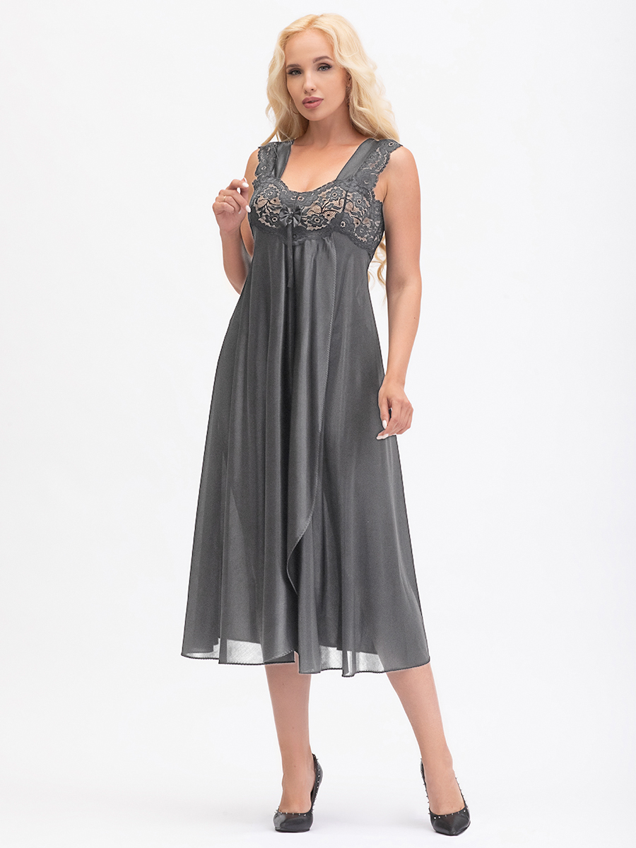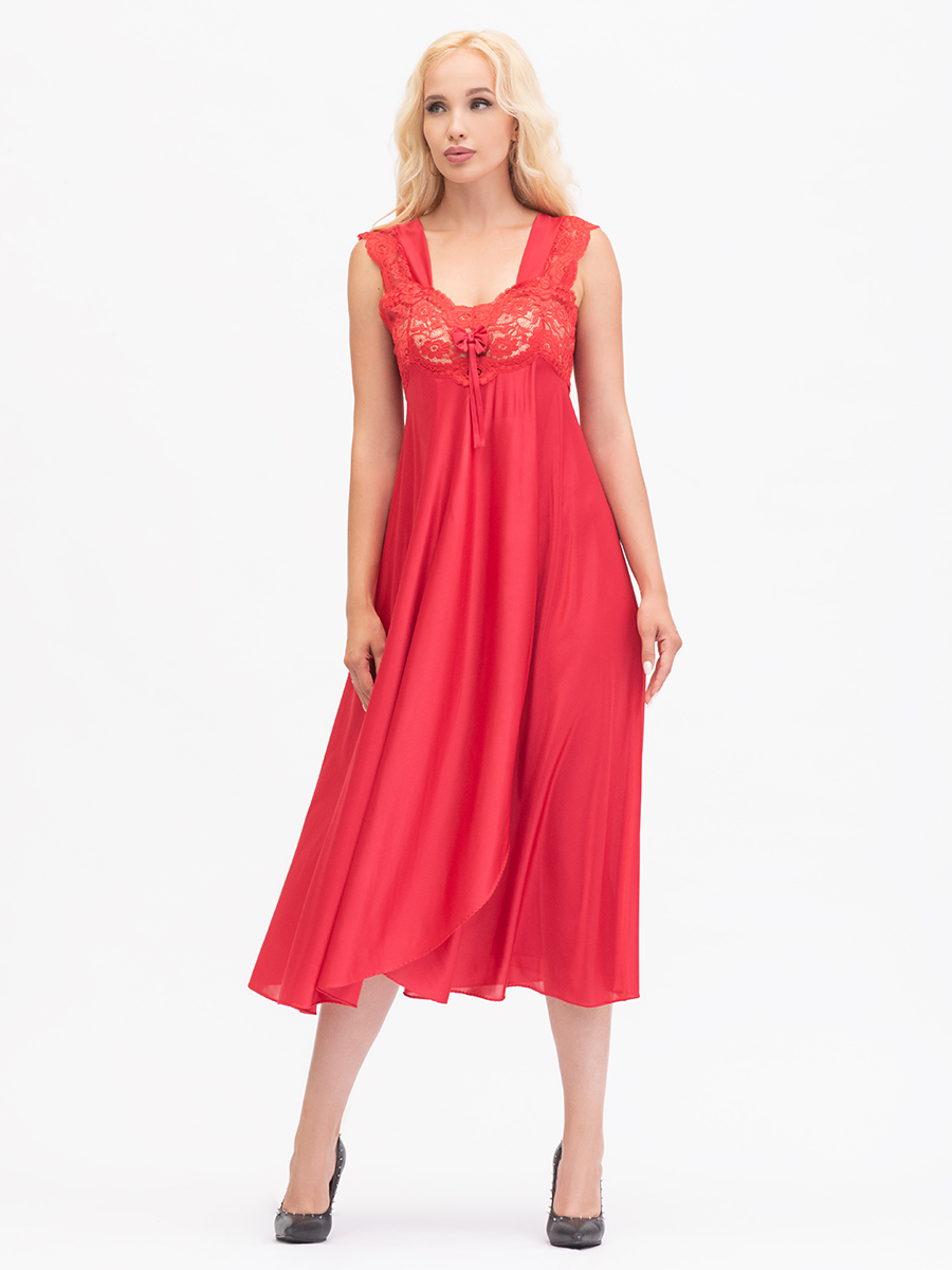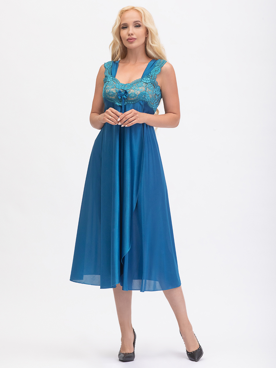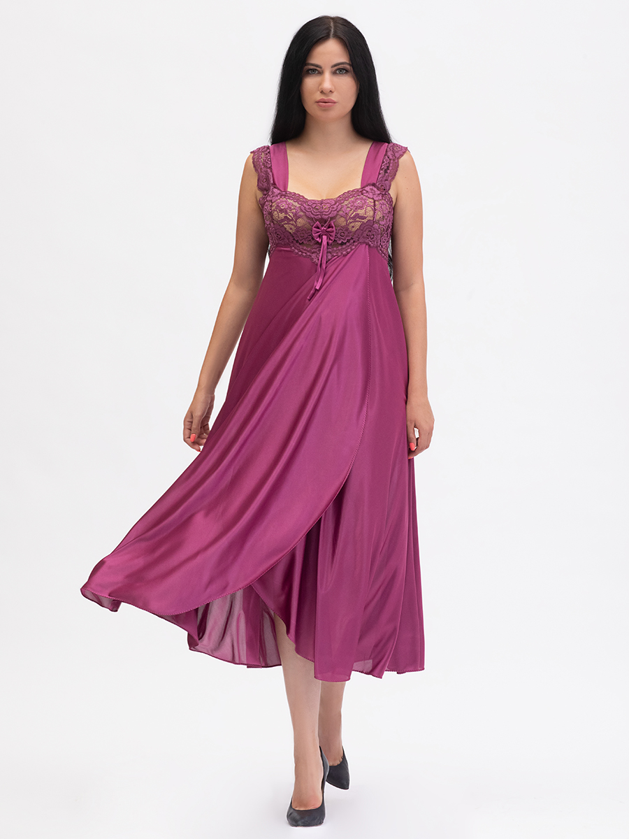 Нарядная длинная сорочка выполнена из однотонного шёлкового трикотажа, полуприлегающего силуэта, расширенная книзу, с передней деталью "на запах"; широкие бретели, украшены кружевом, лиф сорочки из эластичного кружева. Декорирована бантиком на груди.