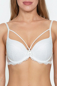 Бюстгальтер на каркасах с бесшовными формованными чашками из 3D материала Spacer (Спейсер). Под термином «Spacer» понимается очень легкий и дышащий материал, приятный на ощупь, прекрасно держащий форму. Несъемные регулируемые бретели. Эластичный пояс с классической застежкой на спине на крючки. Декорирован бантиком с подвеской из трех страз.