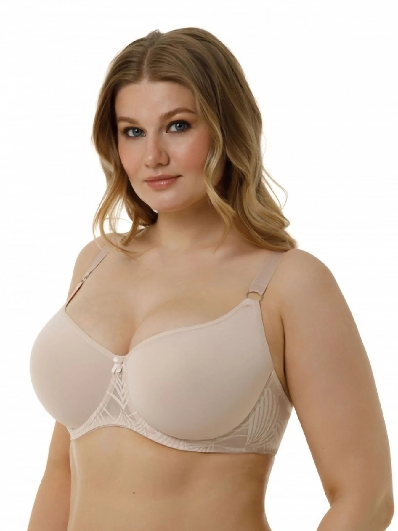 Бюстгальтер бежевого цвета классической формы на каркасах. Чашка бюстгальтера сделана по уникальной технологии. Структура материала чашки-SPACER пропускает воздух, что позволяет коже дышать под формообразующим слоем. Благодаря этому чашечка отличается повышенным комфортом. Стан плотно облегает тело и обеспечивает стабильную комфортную посадку бюстгальтера на фигуре.