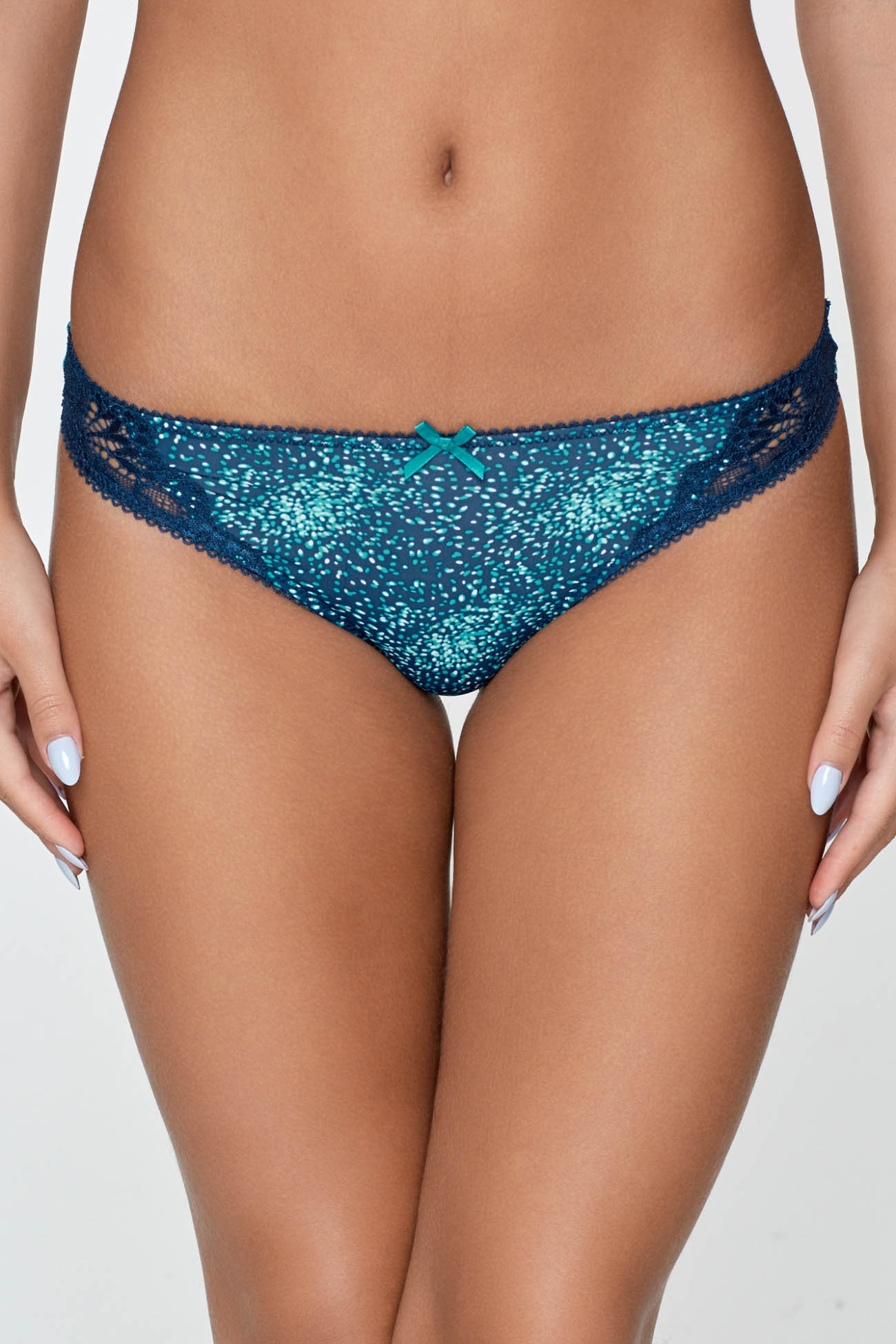 Трусы стринги из эластичного принтованного полотна и кружева. Декорированы бантиком по центру.