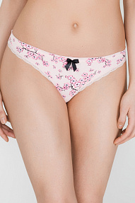 Трусики-стринг из эластичной принтованной ткани, декорированные узким кружевом. Передняя деталь декорирована контрастным атласным бантиком. .