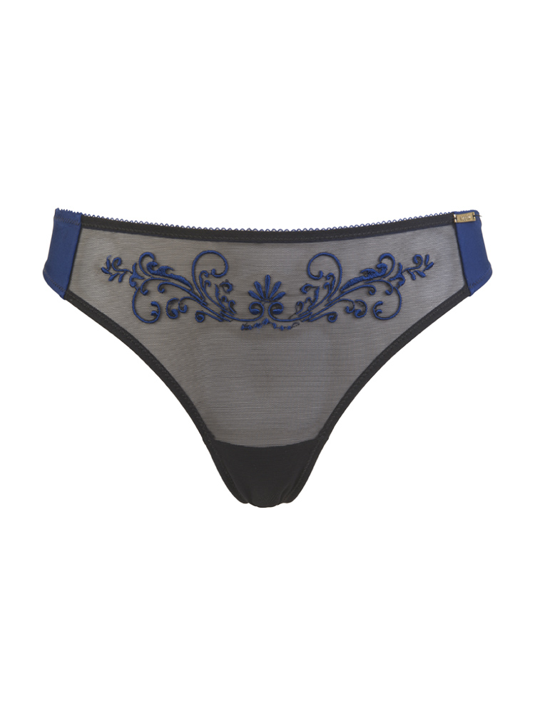 Эксклюзивные трусики танга, выполненные из прозрачной черной ткани с синей вышивкой.