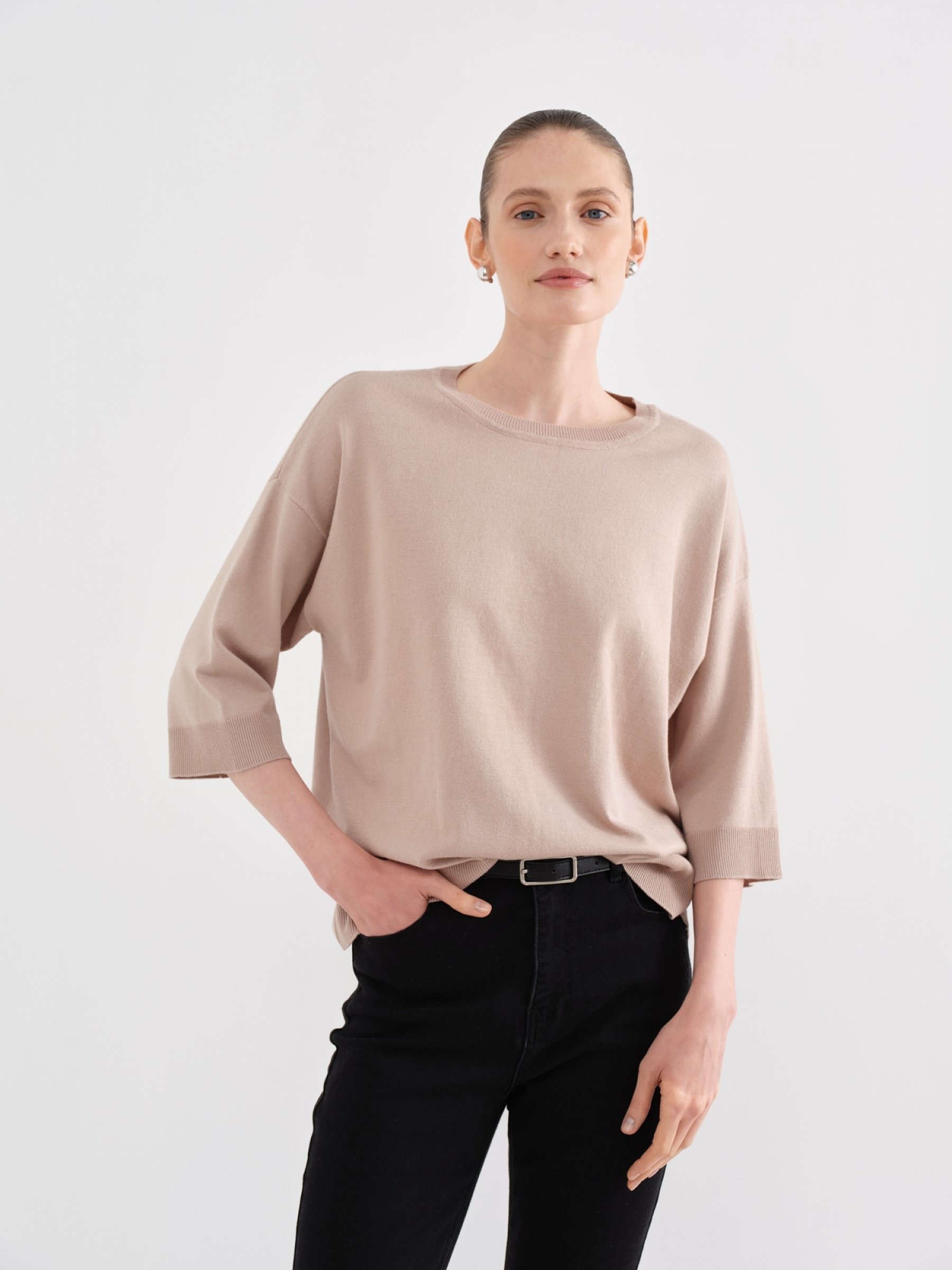 Базовый джемпер в нейтральных оттенках сочетается почти со всем, это отличная инвестиция в повседневный гардероб. У модели классическое исполнение: изящная горловина "лодочка", прямой свободный крой, правильная средняя длина. Спущенная линия плеча адаптирует изделие под особенности фигуры. Легкое трикотажное полотно гладкой вязки на основе вискозы с добавлением нейлона приятно обволакивает, “помнит” изначальную форму и удобно в уходе.