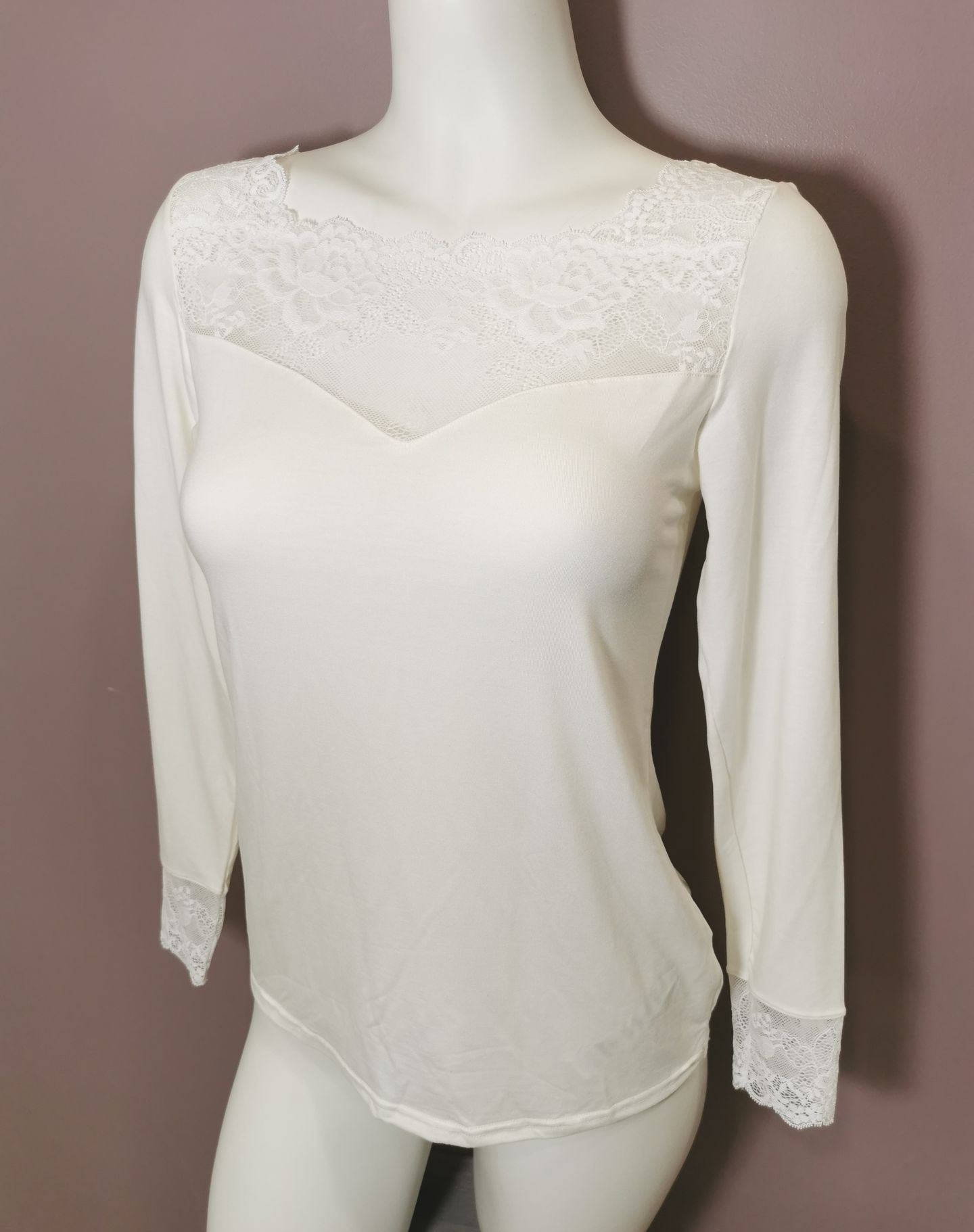 Кофта из эластичной вискозы с длинным рукавом и вырезом "лодочка". Верхняя часть модели и манжеты выполнены из эластичного кружева.