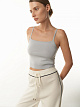 Облегающий мини-топ универсального базового цвета на тонких бретелях впишется практически в любой образ. Изделие выполнено из плотного трикотажного полотна на основе вискозы. . По низу изделия – широкая резинка в тон. Топ украшен металлическим шильдом с логотипом бренда.